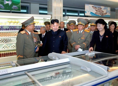 새로 준공된 만수교고기상점을 돌아보시는 김정은제1위원장(조선중앙통신)