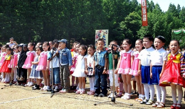 친선련환모임에서 노래를 부르는 조선과 외국어린이들(조선중앙통신)
