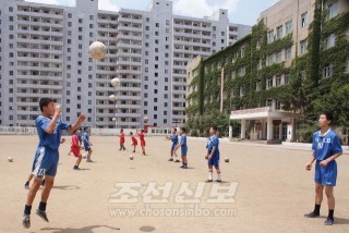 전국대회를 앞두고 맹훈련을 하는 평양5월13일룡남중학교 축구반학생들(평양지국)