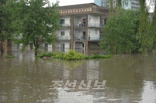 무더기비에 의해 침수한 평안남도 안주시의 살림집(조선중앙통신)