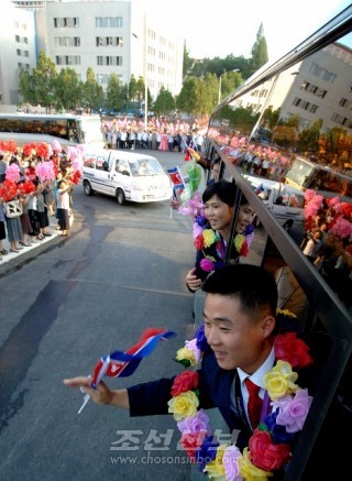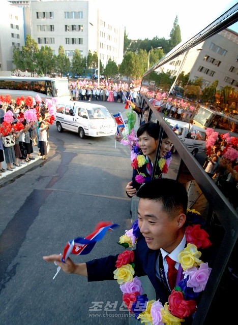 평양시민들이 조선선수단을 수십리연도에서 열광적으로 환영하였다.(조선중앙통신)