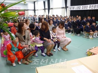 岡山조선초중급학교 2013학년도 입학식. 《향 30》 성원들의 아들딸들 6명이 입학하였다.