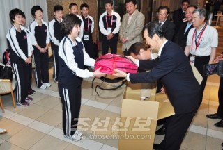 〈세계탁구선수권〉탁구협회가 선수들에게 선물전달