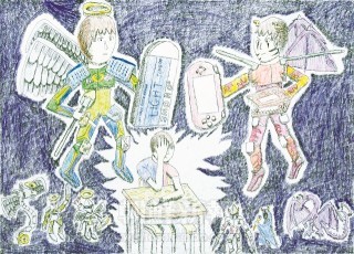 〈子ども美術館-第40回学生美術展 14〉自分との戦い(ボールペン、色鉛筆)