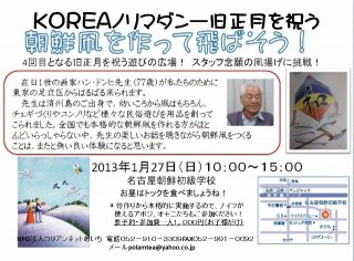 KOREAノリマダン-旧正月を祝う 「朝鮮凧を作って飛ばそう!」 日時:1月27日(日)、10時~15時 場所:名古屋朝鮮初級学校 参加費:一人1,000円(子どものみ) ※在日同胞1世の画家・韓東輝 … 続きを読む NPO法人コリアンネットあいち主催イベント