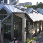 「多様なものが相互に認め合い、同時に存在し得る平和な世界」を表した三角、四角形の屋根でデザインされた「ピースおおさか」。