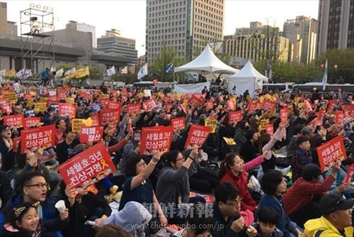 セウォル号事件3周忌を1日前に控えた15日。光化門前広場では「第22回汎国民行動の日」本集会が行われ、約10万人がキャンドルを掲げた。また檀園高校の生徒・教師などセウォル号惨事の最大被害地域である京畿道安山市では16日、「セウォル号惨事から3年、記憶式」が行われた。セウォル号3周忌を迎え、南朝鮮の91の地域、海外11ヶ国40の都市でも追悼行事が催された。追悼行事の参加者たちが求めたのは、セウォル号事件の真相調査と責任者処罰、徹底した朴槿恵に対する捜査と処罰、共犯者逮捕・積弊の清算だ。