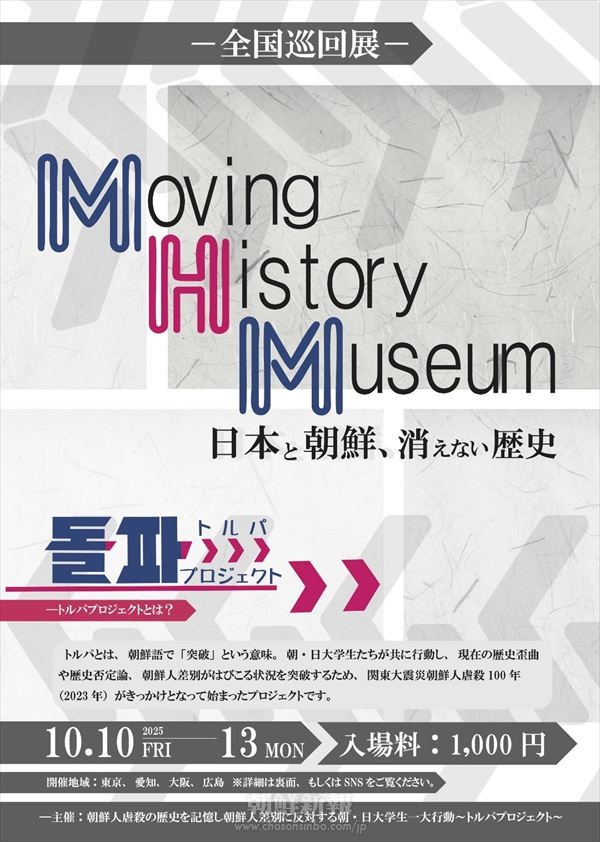 10月10日から13日にかけてトルパプロジェクトは全国巡回展「Moving History Museum~日本と朝鮮、消えない歴史(以下、巡回展)」を行う。 トルパプロジェクトとは、留学同の学生と日本…