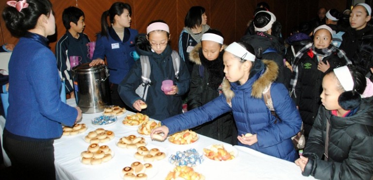 재일조선학생소년예술단이 숙박하는 평양호텔의 종업원 2명이 매일 오전과 오후에 학생들에게 다과와 꿀물을 공급하고있다. 다과의 종류는 속빵, 단설기(카스테라), 과자, 사탕(엿), 사 … 続きを読む 다과와 꿀물로 힘 얻어/휴식시간에 느끼는 조국의 따스함