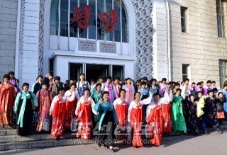 사진은 제4차 전국어머니대회에 참가하기 위하여 평양역에 도착한 대표들(조선중앙통신)