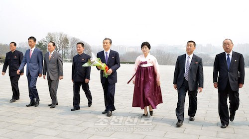 이날 대표단 성원들은 만수대언덕에 모신 김일성주석님과 김정일장군님의 동상을 찾아 경모의 정을 표시하였다.(사진)