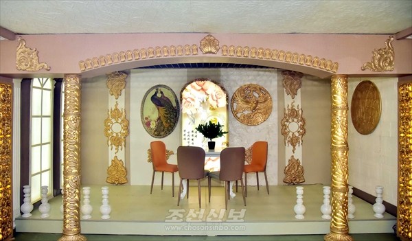 살림방의 천정과 벽면,원형기둥은 물론 침대와 공예작품 등의 건축장식부각,투각장식도 모두 경소마그네샤장식판으로 시공되였는데 그 질과 예술성이 우수하여 전람회에서 높은 평가를 받았다.