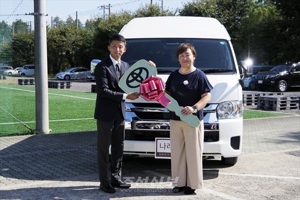 증정식에서는 초대 어머니회장, 김일중학교장, 주영순회장, 학생대표가 데프를 끊고 이바라기초중고 학생들이 새 뻐스 기증을 축하하여 노래를 불렀다.