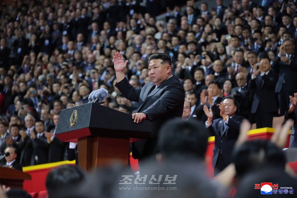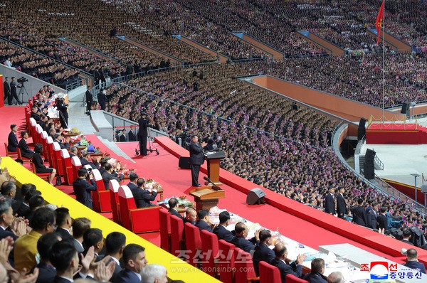 김정은동지께서 연설을 마치시자 향도의 우리 당을 따라 전면적국가부흥의 활로를 힘차게 열어나가며 사회주의 우리 조국을 이 세상 가장 강대하고 존엄높은 나라로 그 위용 만방에 떨쳐갈 인민의 드팀없는 신념과 의지가 폭풍같은 《만세!》의 환호성으로 터져올랐다.