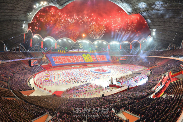 조선로동당창건 80돐경축 대집단체조와 예술공연 《조선로동당 만세》가 성대히 진행되였다.