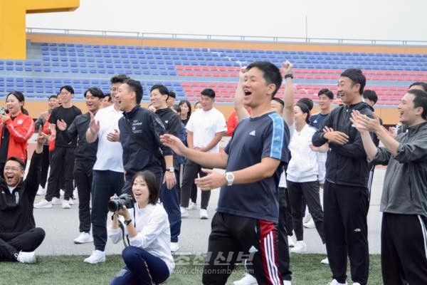 서산축구경기장에서 훈련을 거듭한 이어달리기대표단 성원들(사진촬영=김숙미기자)