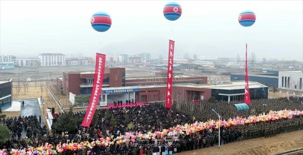 지방공업혁명의 전초를 지켜선 혁명군대의 위상을 떨치며 발걸음도 드높이 준공식장으로 들어서는 군인건설자들을 곡산군의 근로자들과 청년학생들, 어린이들이 꽃다발을 흔들며 반겨맞아주었다.