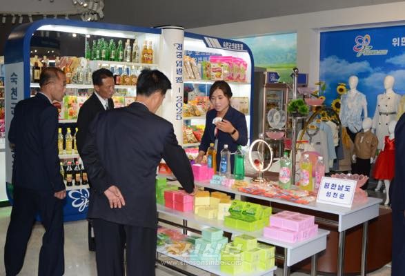 경공업의 비약적발전을 보여준 전시회. 2.8비날론련합기업소에서 생산한 화학제품은 지방공업공장의 생산활동에도 한몫하고있다.