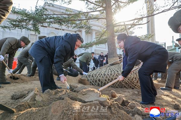 김정은동지께서는 지도간부들과 함께 기념관원림조성계획에 따라 진행되는 식수의 첫삽을 뜨시였다.