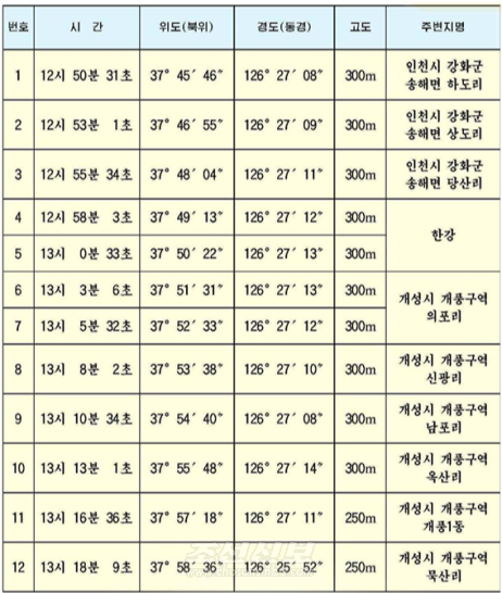 무인기에 입력된 비행계획과 기록된 비행리력자료들을 분석한데 의하면 해당 무인기는 경기도 파주시 적성면 장좌리에서 리륙하여 공화국령내의 개성시 개풍구역,황해북도 평산군,개성시 개풍구역,판문구역을 거쳐 발진지점까지 총 167㎞의 거리를 300m의 고도에서 50㎞/h의 속도로 3시간 20분동안 비행하면서 황해북도 평산군의 일부 대상,개성시 자남산,판문점,이전 개성공업지구,국경선일대의 아군초소를 비롯한 중요대상물들을 촬영하도록 되여있었다.