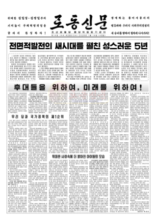 -《전면적발전의 새시대를 펼친 성스러운 5년》이라는 표제아래 우리 당과 국가정책의 제1순위는 언제나 후대들을 위한 시책이며 이것은 조선로동당의 절대불변의 원칙,공화국의 영원한 국책이라고 강조한 글