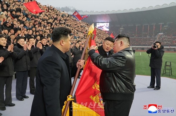 김정은동지께서는 사회주의애국청년동맹기발에 김정일훈장을 달아주시고 청년동맹중앙위원회 위원장에게 훈장증서를 전달하시였다.