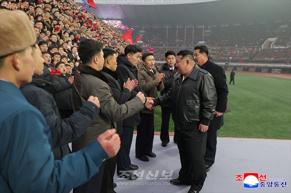 김정은동지께서는 열광의 환호에 따뜻이 답례하시며 청춘의 아름다운 희망과 포부를 조국의 번영을 위함에 깡그리 바치며 값높은 위훈의 자욱을 새겨가고있는 온 나라 청년들에게 축하의 인사를 보내시였다.