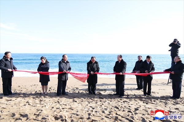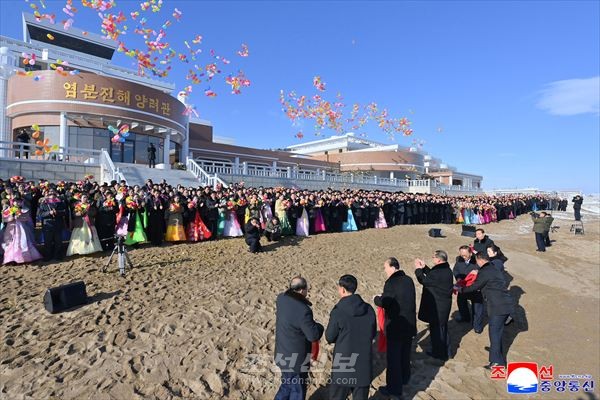 《당이여 그대 있기에》의 노래선률이 울려퍼지는 가운데 조선민주주의인민공화국 내각 총리 박태성동지가 인민의 참된 복무자로서의 영예를 빛내여갈 열의에 충만된 염분진해양려관 일군,종업원들과 함께 준공테프를 끊었다.