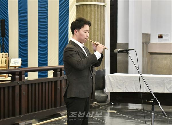 조대 민족관현악부에 속한 리석준학생(문학력사학부 3학년)이 추도곡을 연주한 다음 국평사 윤벽암스님이 독경을 하였다.