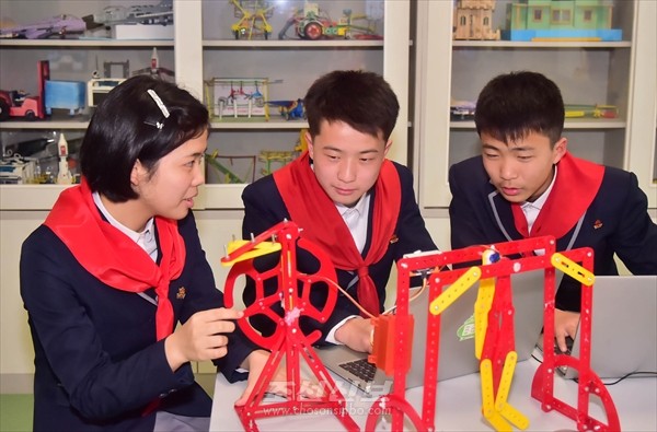 로보트를 리용하여 착상력을 키우는 학생들