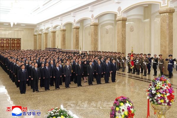 김일성주석님의 탄생일에 즈음하여 당과 정부의 간부들 금수산태양궁전을 찾아 숭고한 경의를 표시하였다. (조선중앙통신)
