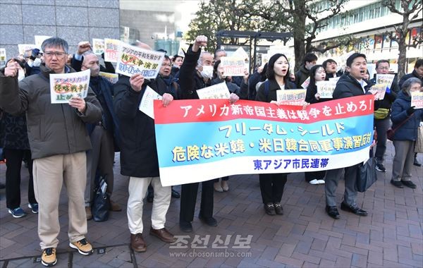 긴장격화시키는 전쟁연습을 반대 / 시민단체가 미대사관에 항의