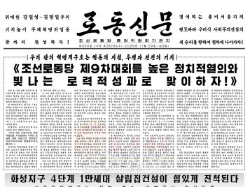 1면 -우리 당의 혁명적구호 《조선로동당 제9차대회를 높은 정치적열의와 빛나는 로력적성과로 맞이하자!》에 대해 해설한 글 -화성지구 4단계 1만세대 살림집외부공사 전부 결속,내부공…