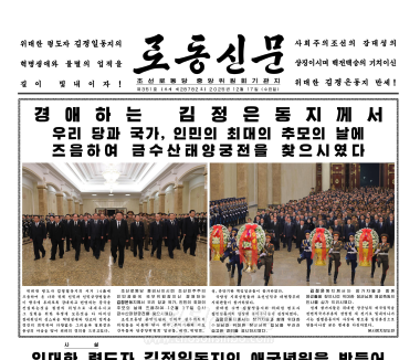 조선중앙통신은 김정은원수님께서 당과 국가, 인민의 최대의 추모의 날에 즈음하여 금수산태양궁전을 찾으신 소식을 다음과 같이 전하였다. 위대한 령도자 김정일동지의 서거 14돐에 즈음하…