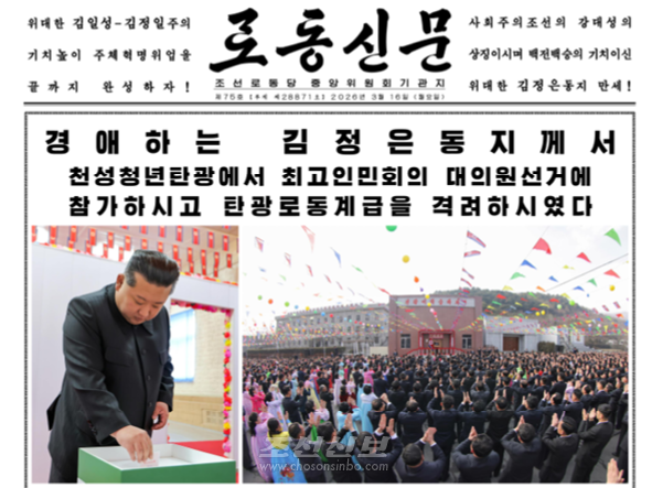 1,2면 -경애하는 김정은동지께서 천성청년탄광에서 최고인민회의 대의원선거에 참가하시고 탄광로동계급을 격려하신 소식과 사진문헌들 3면 -천성청년탄광 로동계급과 일군들앞에서 한 김정은…