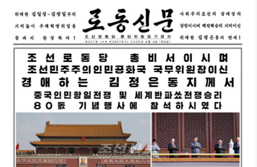 1, 2면 -경애하는 김정은동지께서 중국인민항일전쟁 및 세계반파쑈전쟁승리 80돐 기념행사에 참석하신 소식과 사진문헌들(3면으로 계속) 3면 -경애하는 김정은동지께서 로씨야련방 대통…
