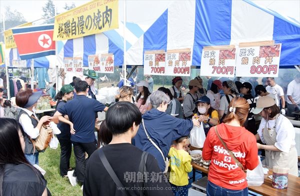 同コーナーには、女性同盟江戸川支部が主導する屋台も出店された。朝鮮の国旗と、「総聯自慢の焼肉」と銘打った看板が高々と掲げられた屋台は、総聯支部をはじめとした50人近くの江戸川同胞たちのサポートもあり、220kgの肉を早期完売の成果で終えた。