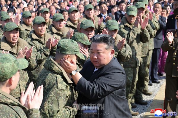 金正恩総書記は、着工式に参加した海外軍事作戦参戦軍人たちを温かく抱きしめながら健康を回復したかれらを力強く激励した。(朝鮮中央通信=朝鮮通信)