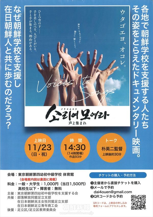 内容:日本各地の朝鮮学校を応援する日本の市民たちに焦点を当てた朴英二監督の「ソリヨモヨラ(声よ集まれ)」の上映会。朴英二監督によるトーク