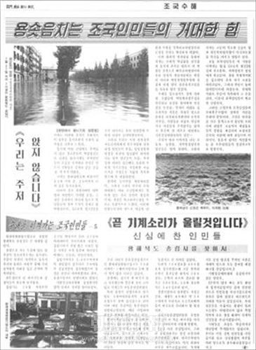 記事には降水量、被害住民数と死亡者、被災世帯数、被害額、農耕地の被害面積、破壊されなどの被害情報が詳しく記され、被災状況を鮮明に写した写真も掲載された。土砂が崩れ、アパートは水に浸り、田んぼや農作物も土に埋もれた。しかし、かれらが見たものはふいに訪れた自然災害だけではなかった。復旧作業を続ける人民たち、生活の安定のために昼夜問わず走り回る活動家たち。紙面には「試練は必ず克服できる」、「奮い立つ祖国人民たちの巨大な力」、「わたしたちは立ち止まらない」などの力強い見出しが並んだ。この水害に関する連載のタイトルは「水害を勝ちゆく祖国人民たち」。祖国に対する信念なしには書けない記事だった。