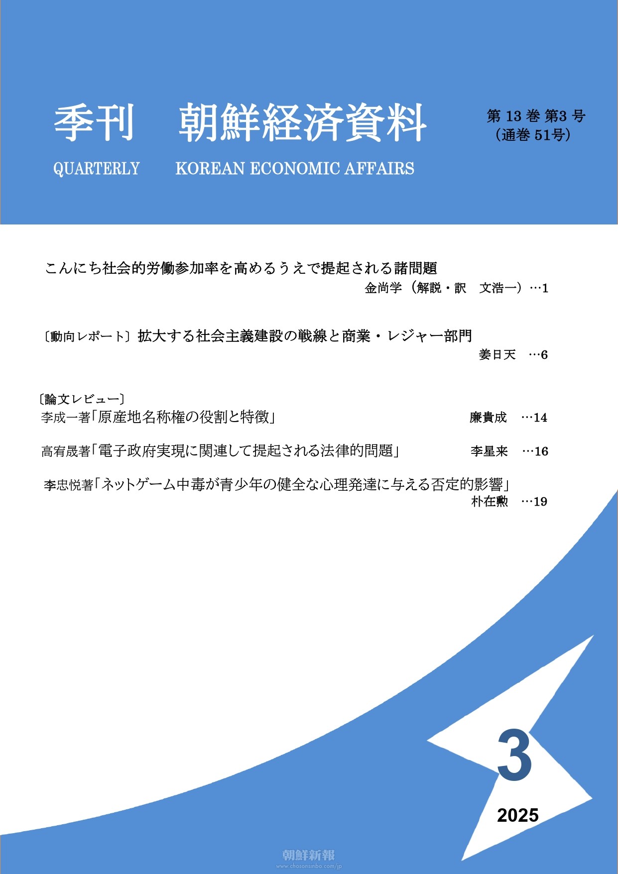 今号はこのほかに3本の論文に関するレビューを掲載。『金日成綜合大学学報(法律学) 』第71 巻第2号に掲載された「原産地名称権の役割と特徴」、『金日成綜合大学学報(法律学)』2025年第2号に掲載された「電子政府実現に関連して提起される法律的問題」、『社会科学院学報』2025年2号に掲載された「ネットゲーム中毒が青少年の健全な心理発達に与える否定的影響」に関して、廉貴成、李星来、朴在勲氏がそれぞれレビューを寄せている。
