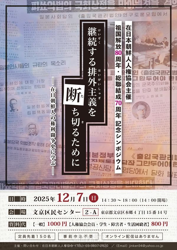内容:祖国解放80周年・総聯結成70周年を記念したシンポジウム。第1部は「記者として経験した1960−70年代の権利闘争」をテーマに、姜惠眞さん(人権協会顧問・元『朝鮮新報』記者)と鄭栄桓さん(明治学院大学教員・人権協会常任理事)の対談。第2部パネルディスカッションは、「排外主義と『同化』に立ち向かうために:運動の”これから”を探る」をテーマに、指宿昭一さん(弁護士)、裵明玉さん(弁護士・人権協会副会長)、姜惠眞さんが登壇する。