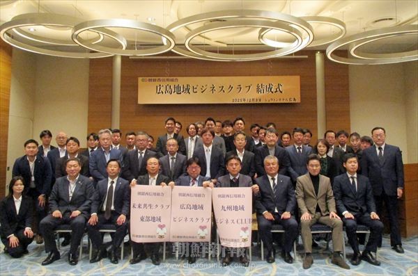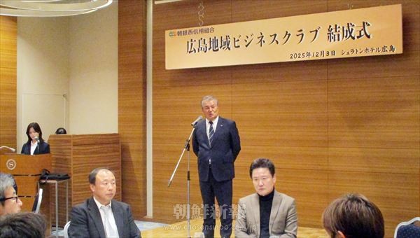 朝銀西信用組合は3日、シェラトンホテル広島で同信組の後援会組織3拠点目となる「朝銀西広島地域ビジネスクラブ」の結成式を開催。同クラブの会員、来賓、同信組芮朝男理事長以下役職員を含め50人が参加した。