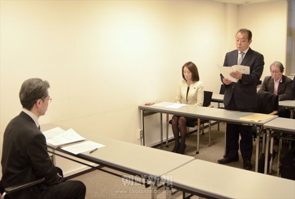 尹太吉会長が要請書を読み上げ、文科省担当者に手渡した(写真=朴忠信)