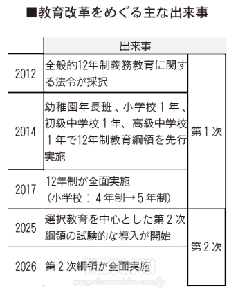 新制度導入に伴い、第1次全般的12年制義務教育綱領が実施されたが、第2次綱領は、26年度から実施される。教育部門では新綱領実施に先立ち、25年を準備段階、経験蓄積段階として定め、本格的な準備に取り組んできた。