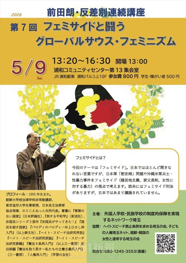 内容:朝鮮大学校非常勤講師の前田朗さんによる講座「フェミサイドと闘うグローバルサウス・フェミニズム」