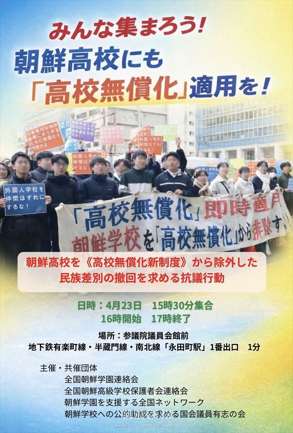 内容:高校の授業料無償化を拡充する改正法が可決されたが、朝鮮学校は対象外に置かれ続けている。日本政府に民族差別撤回を求め抗議糾弾する。