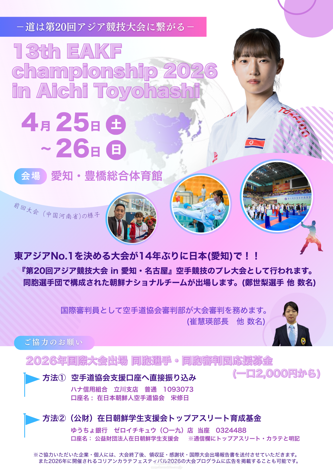 4月25、26日にかけて愛知で開催される第13回東アジア空手道選手権大会に、同胞選手3人が朝鮮代表として出場する。同大会は、9~10月に愛知・名古屋で行われる第20回アジア競技大会・空手競技のプレ大会に位置づけられており、会場も同じ豊橋市総合体育館となる。