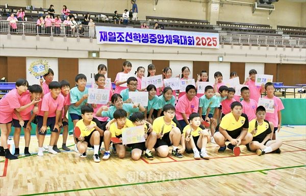 学生中央体育大会初級部卓球競技に参加した大阪初級と東京第5初中(水色の服)で仲良く記念撮影。大阪の児童が用意した応援プラカードには東京第5の児童たち、引率教員の名前も。児童らにとって今大会は交流を深め…